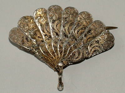 GOLD PLT SILVER CHINESE FAN FINE ANTIQUE BROOCH