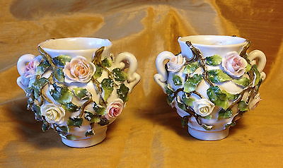 Title (ebay affiliate link): Antique Pair 3.5" Vases w Applied Porcelain Roses/Leaves w Cross Hatch Mark