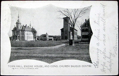Title (ebay affiliate link): SAUGUS CENTER, MASSACHUSETTS: Town Hall, Fire Engine House & Church Bldgs. c1905