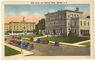 Oswego N.Y. Post Office & Pontiac Hotel 1950 postcard Old Cars