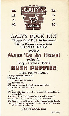 Title (ebay affiliate link): Gary's Duck Inn Hush Puppies Recipe - Vintage Postcard, Orlando, Florida