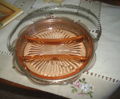Title (ebay affiliate link): Pink Depression Glass divided relish tray w/ carrier