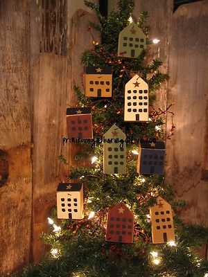 Title (ebay affiliate link): ~ 9 Primitive Wood Folk Art SALTBOX HOUSE Star Ornaments Ornies OOAK BY HSC