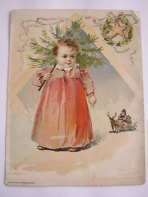 VICTORIAN TRADE CARD, CHRISTMAS, CHILD W/ TREE, LION COFFEE, WOOLSON SPICE 1891