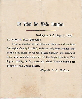 Title (ebay affiliate link): Vintage 1902 He Voted For Wade Hampton Henry C Burn SC Legislature Political Ad