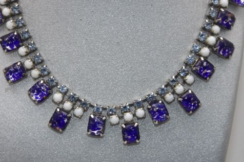 Title (ebay affiliate link): VINTAGE HAND SET BLUE RHINESTONES BLUE ART GLASS & MILK GLASS CHOKER NECKLACE