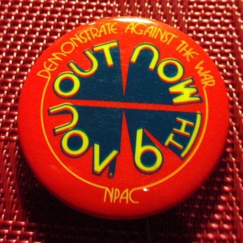 Title (ebay affiliate link): Out Now November 6th Demonstrate Against The War Cause Pinback Button