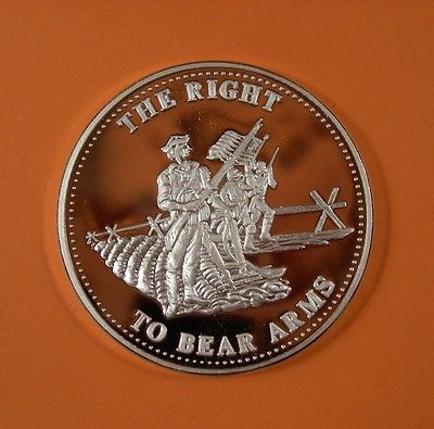 Title (ebay affiliate link): THE RIGHT TO BEAR ARMS 1 OZ ROUND ( 100 MIL of .999 SILVER )