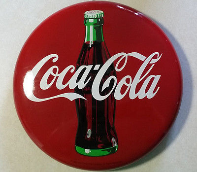 Title (ebay affiliate link): Vintage 1990 Coca Cola bottle Tacker Type Sign Metal Button Sign Coke 12"
