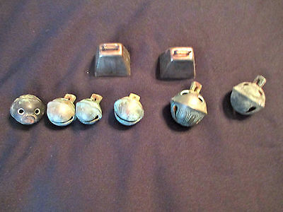 VINTAGE 6 BRONZE/BRASS SLEIGH BELLS+ 2 IRON COW BELLS 1.75 X 2"