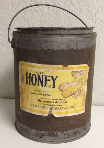 Title (ebay affiliate link): Vitg 5 lb Honey Tin, Lid Bail Paper Label Herman's Apiaries Bees Manchester Iowa