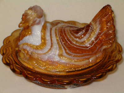AMBER & MILK SLAG GLASS HEN CHICKEN ON NEST BASKET DISH