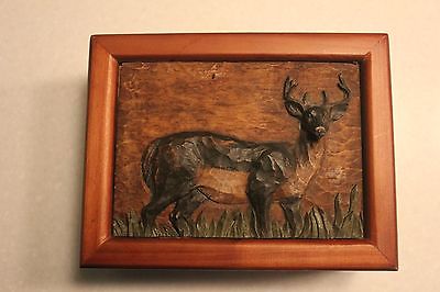 HAND CARVED WOODEN BOX - DEER - with Brass hinges - Nice Storage Box for Dresser