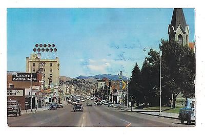 Postcard-Busy Main St, Bozeman MT in 1968-Cars/Signs/Chevy Dealer/Texaco/Hotel