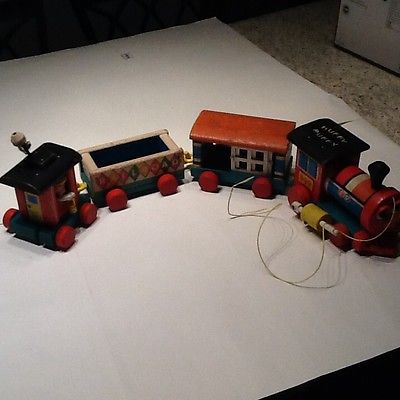 Title (ebay affiliate link): 1963 Vintage Fisher Price Wooden Train Set Huffy-Puffy 4 piece set Working Toy