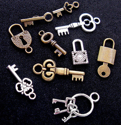 Title (ebay affiliate link): Skeleton Key Lock Vintage Silver 10 Charm Pendant Scrapbook Jewelry Padlock Lot