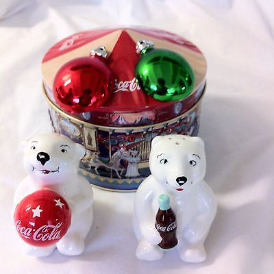 POLAR BEAR SALT & PEPPER 5 COCA COLA TRIM-A-TREE COLLECTION ORNAMENTS + TIN!!!