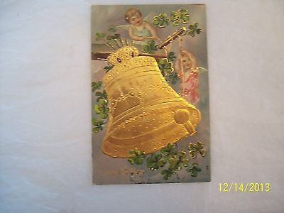 New Years Gold bell embossed Shamrocks & Angels ringing the bell # 966 nice