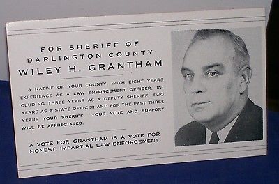 Title (ebay affiliate link): Political Campaign Card - Darlington County, SC - Wiley Grantham - 1940's - Mint