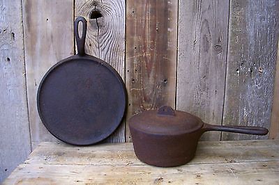2 Old Vintage Cast Iron Cookware Pieces Griddle & Sauce Pan ~ Cabin Camp Decor