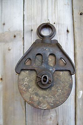 Antique Embossed Cast Iron & Wood Barn Pulley ~ Old Vtg Farm Tool Rustic Decor