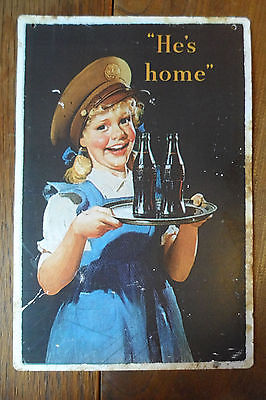 VINTAGE COCA COLA 1944 AD "HE'S HOME" THICK PAPER OVERLAY ON METAL NAIL IN SIGN