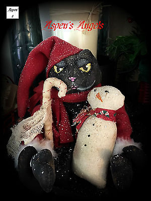 PRIMITIVE CAT DOLL In SANTA HAT HOLDING SNOWMAN CHRISTMAS ASPENS ANGELS