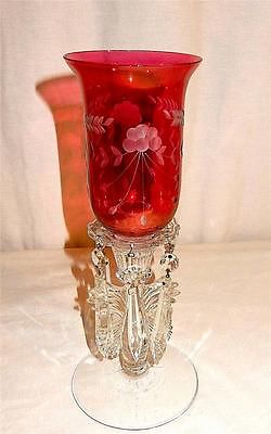 Vintage Ruby Flash Cut to Clear Glass Candle Holder w Bobeche & Prisms