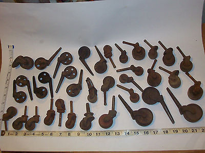 34 vintage caster wheels. Cast on wood & cast on metal. Dresser, shelf, table