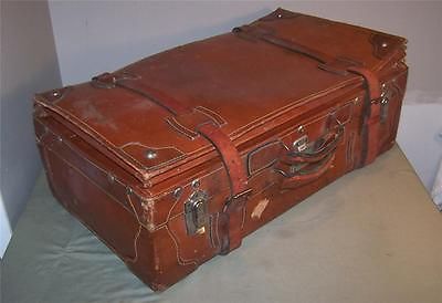 LARGE ANTIQUE LEATHER SUITCASE LEATHER TRAVEL TRUNK LEATHER STEAMER TRUNK OLD nr
