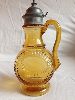 ANTIQUE EAPG AMBER SYRUP PITCHER W PEWTER LID 19TH CENTURY GLASS APPLIED HANDLE