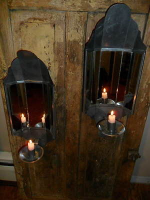 Primitive Candle Sconces- Set of 2, Tin w/ Candle Stub, Metal with Mirrors, Pair