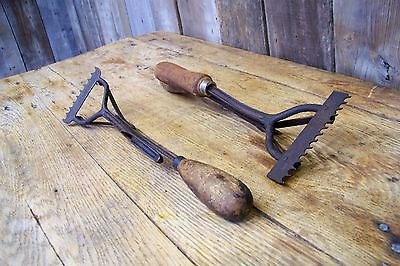 2 Antique Cast Iron & Wood Carpet Stretching Tools ~ Old Vintage Builders Tools