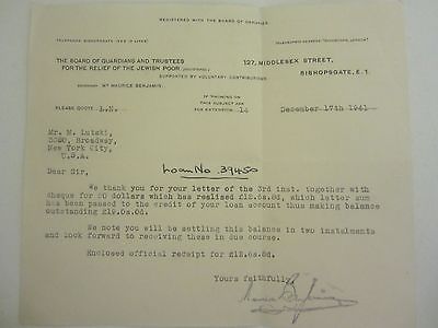 Judaica letter stamped Maurice Benjamin, Board For Jewish Poor, England 1941.