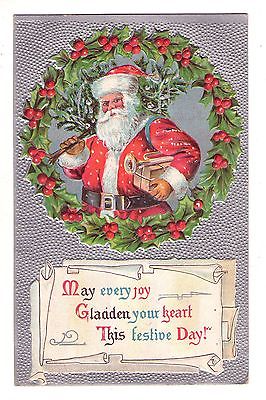 VINTAGE CHRISTMAS POSTCARD SANTA CLAUS WITH TOYS FRAMED IN HOLLY WREATH