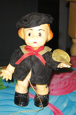 ANTIQUE ALL CELLULOID 6 1/2" DOLL DRESSED AS A PAINTER PULL STRING WALKING DOL