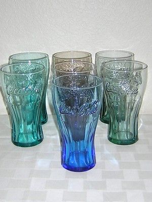 Title (ebay affiliate link): SEVEN 14 OZ. COCA-COLA GLASSES - AMETHYST PURPLE, COBALT BLUE, AND GREEN