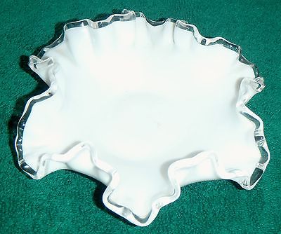 VINTAGE MILK GLASS CANDY DISH w/SCALLOPED RUFFLED EDGES, CLEAR EDGING