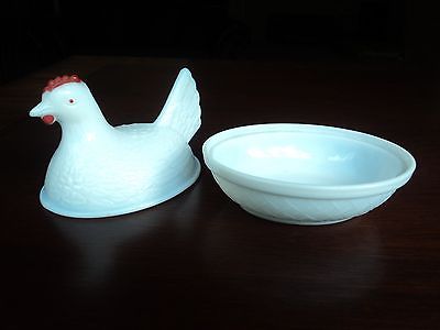 VINTAGE MILK GLASS HEN CHICKEN ON NEST COVERED CANDY DISH