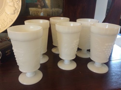 Title (ebay affiliate link): Vintage~Set of 6~Milk Glass~Grape Leaf Harvest~Footed~Goblet~5.5" Tall