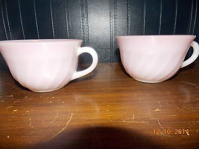 Vintage Pair of Pink Swirl Fire King Oven Ware Coffee Cups w Milk Glass Bottoms