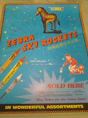 VINTAGE ZEBRA BRAND SKY ROCKETS "SOLD HERE" POSTER Smaller 17x23 VGC