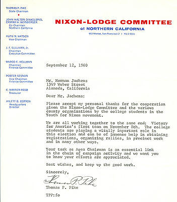 Signed Sept 12 1960 Nixon-Lodge Committee of Northern California Campaign Letter