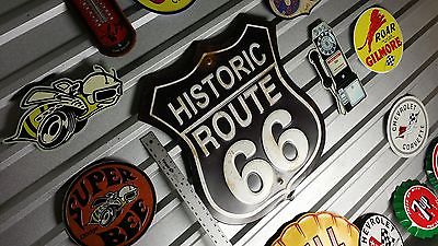 Title (ebay affiliate link): Huge 26" x 30" Embossed Historic ROUTE 66 Road SIGN Highway Garage Mobil Texaco