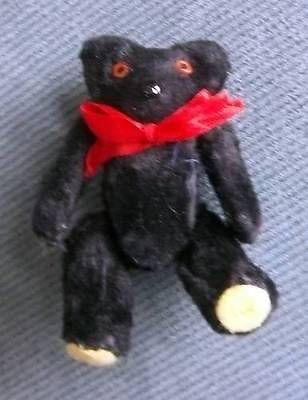 TINY Antique Jointed Black Teddy Bear Glass Eyes Nose Red Ribbon UGOTTAC!!!