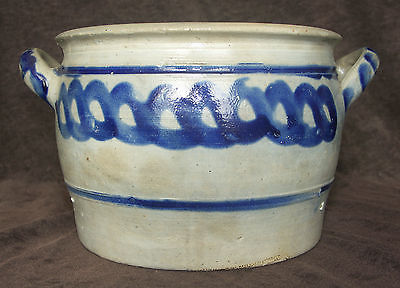 Antique Salt Glazed Stoneware Handled Crock Cobalt Blue Decoration Hand Thrown