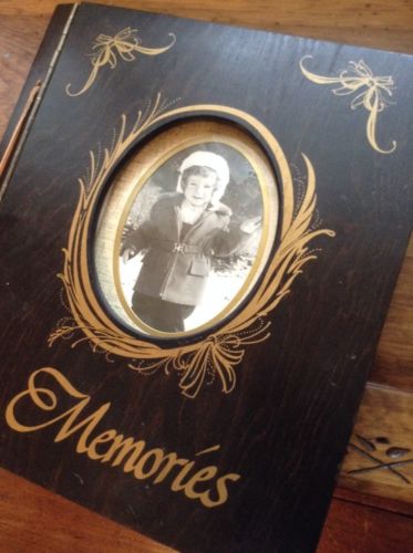 Title (ebay affiliate link): Large VINTAGE WOODEN MEMORIES PHOTO ALBUM w/ STAND, mid-century