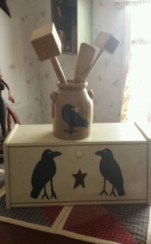 Title (ebay affiliate link): Primitive Americana Crow Kitchen breadbox home decor gathering lot