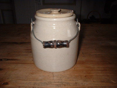 Title (ebay affiliate link): Vintage Stoneware Lidded Crock Wooden Handle Pat. 1896