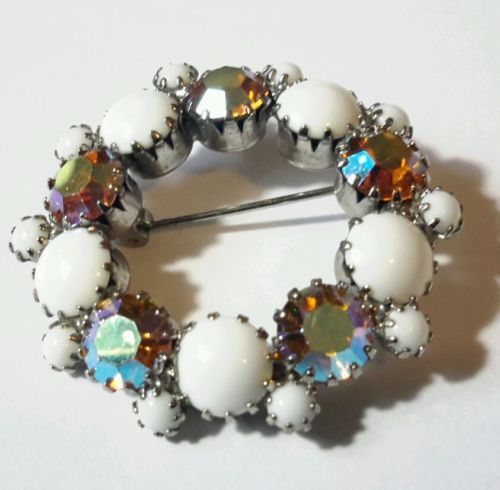 VINTAGE Round 2"s of Milk glass & Aurora Crystals Art Novaux Brooch nice GEMSTON
